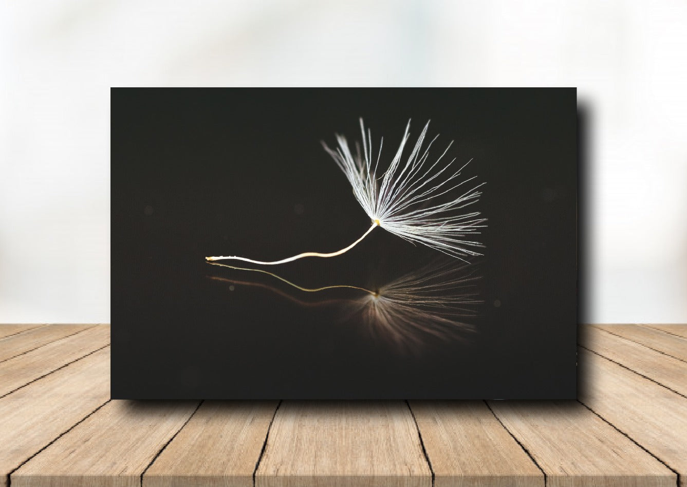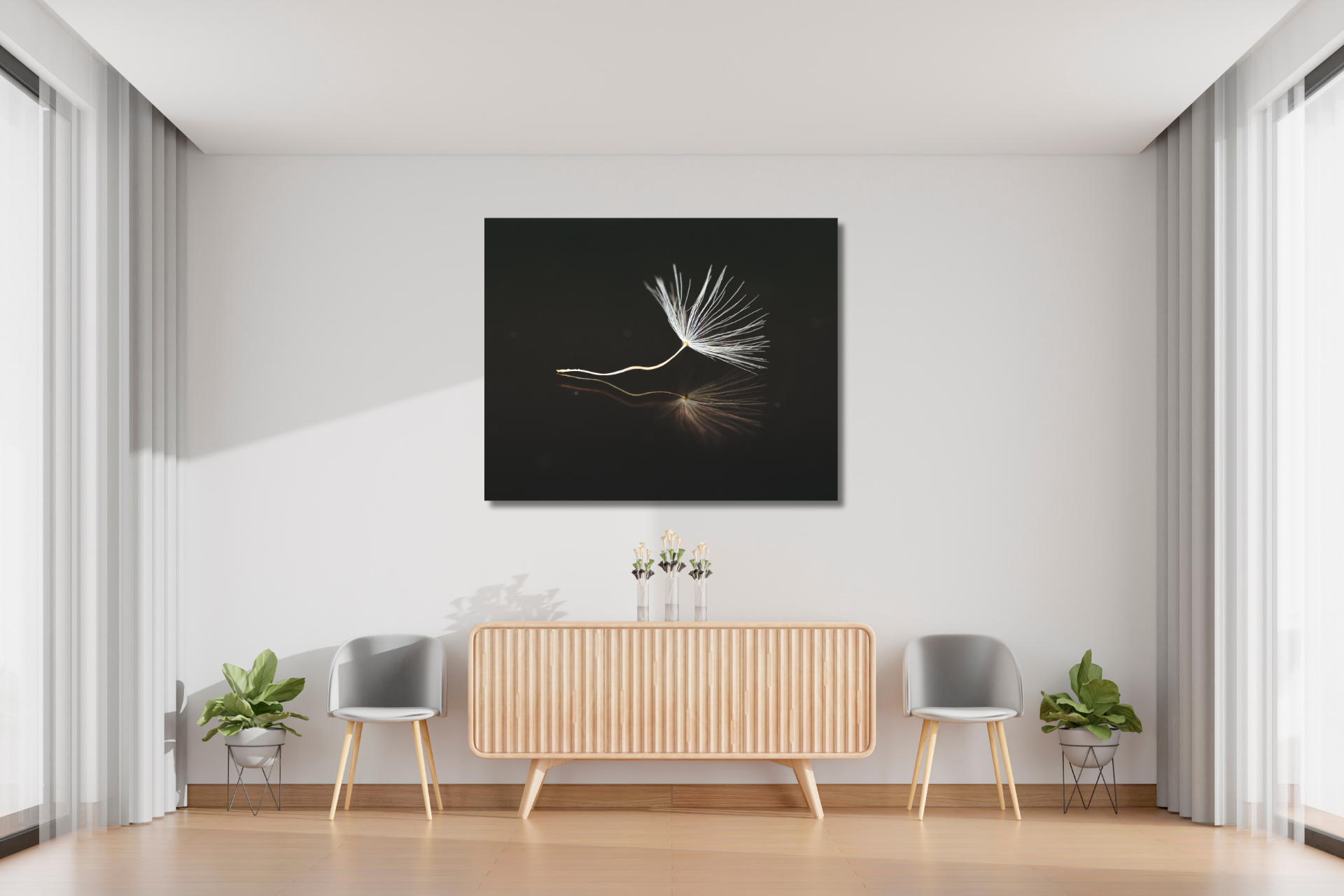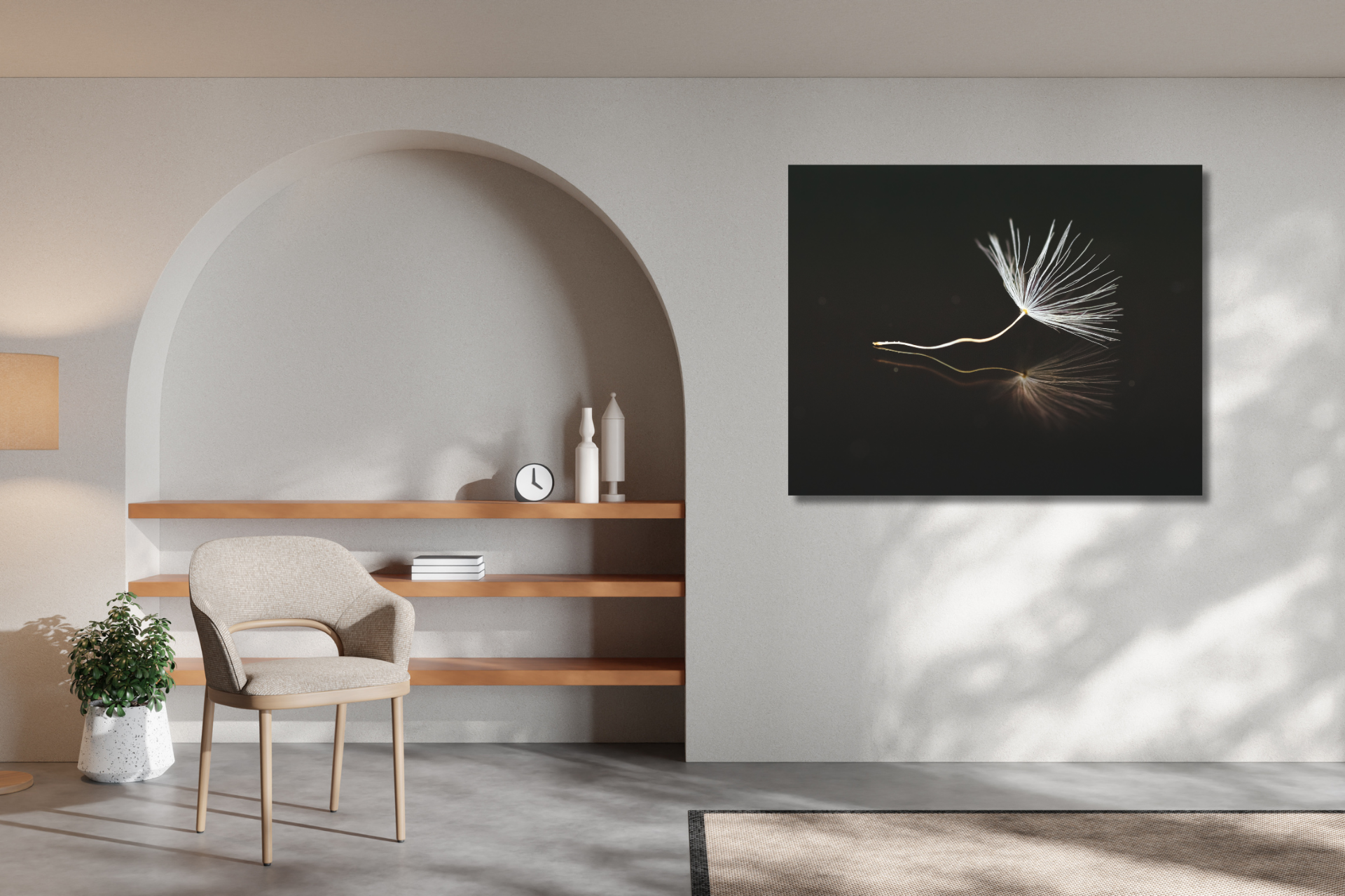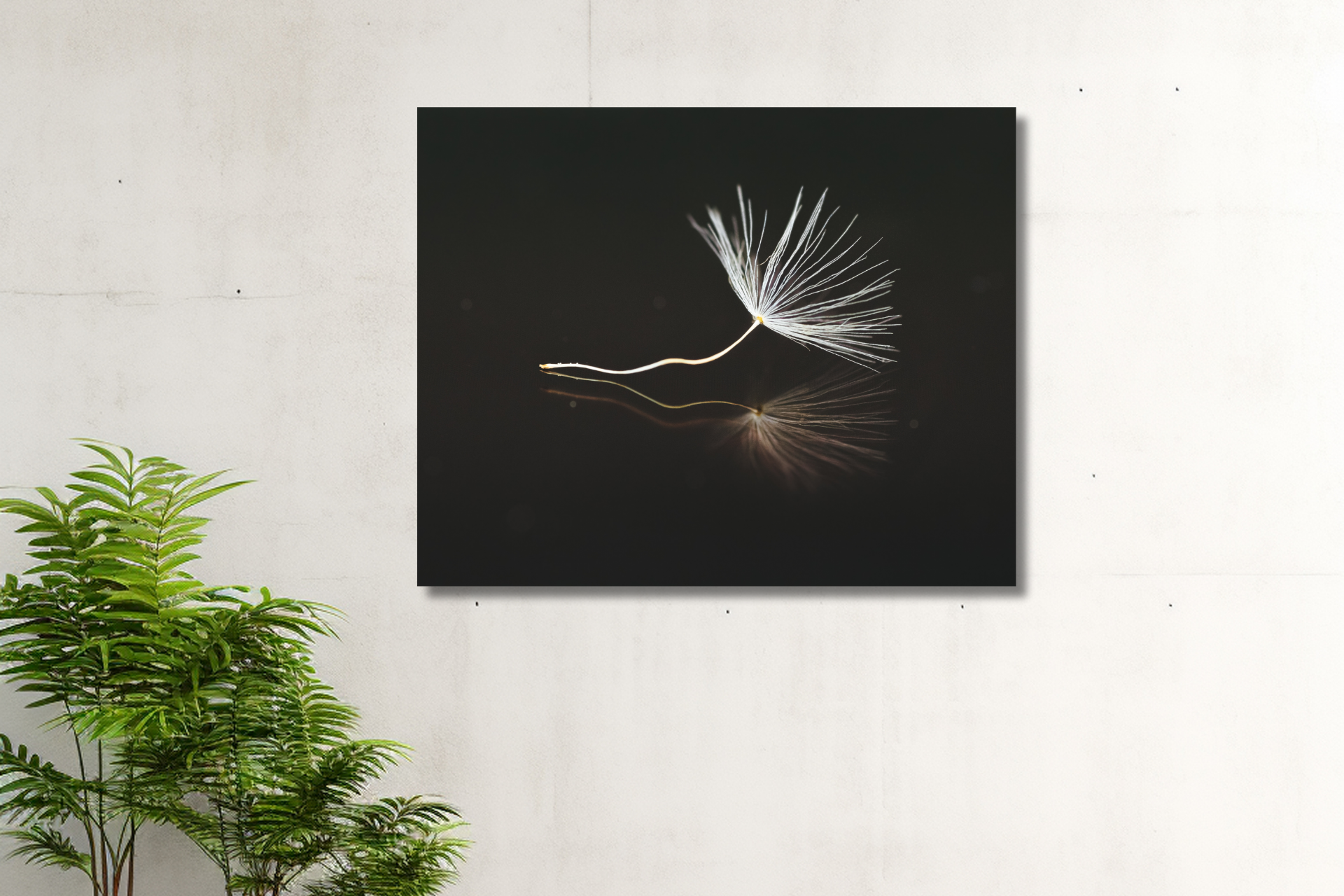 Este cuadro captura la delicadeza y la ligereza en su máxima expresión. Una semilla de diente de león flotando en un fondo oscuro simboliza la fragilidad, la libertad y los nuevos comienzos. Su reflejo sutil añade un toque de profundidad y elegancia, creando una composición minimalista y sofisticada. Ideal para espacios que buscan transmitir calma, serenidad y una conexión con la naturaleza.🍃✨